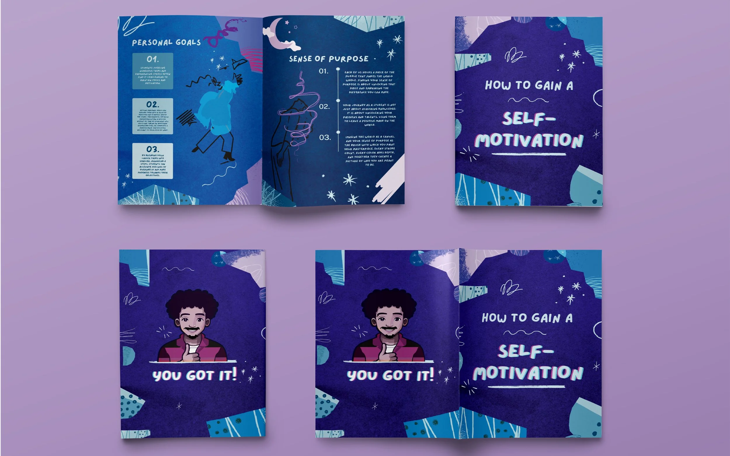 What makes this piece unique is the blend of bold typography, expressive illustrations, and conversational storytelling that transforms motivation into a tactile, interactive experience. Throughout the process, I explored how graphic design can guide emotion—how layout, color, and pacing can influence a reader’s mindset.